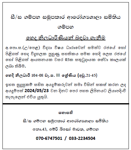 ඉහත සුදුසුකම් සහිත අයදුම්කරුවන් තමා විසින් සකස් කරන ලද අයදුම්පත් 2024/05/23 වන දිනට පෙර පහත ලිපිනයට ලියාපදිංචි තැපෑලෙන් එවිය යුතුයි.
